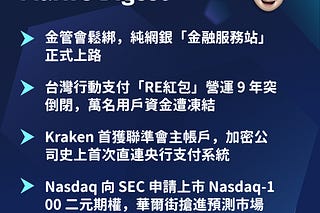 金管會開放純網銀設立金融服務站,走向虛實融合。RE紅包營運9年突倒閉,萬名用戶資金遭凍結凸顯非持牌平台風險。Kraken成為首家直連聯準會支付系統的加密公司。Nasdaq向SEC申請Nasdaq-100二元期權,華爾街搶進預測市場。本週金融科技邊界持續消融,加密與傳統金融加速整合。