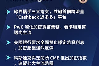 綠界攜手三大電支打造首個跨流量返利平台、PwC 深化加密業務看準穩定幣主流化、美國銀行要求禁止穩定幣發利息引發產業反彈、納斯達克與 CME 聯手推出加密指數,加密貨幣正從邊緣走向主流金融體系的核心。