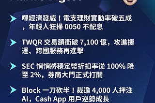 電支理財實動率破五成,年輕人狂掃0050不配息。TWQR交易額衝破7,100億攻進捷運與跨國服務。SEC穩定幣折扣率從100%降至2%,券商大門打開。Block裁半押注AI,Cash App用戶逆勢成長22%。嗶經濟與穩定幣鬆綁雙線並進,行動支付改寫理財版圖。