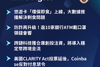 悠遊卡首創支付大數據解決剩食問題、逾 10 家銀行 ATM 導入遮臉偵測防詐、跨鏈科技獲合庫創投注資將導入穩定幣跨境金流、美國 CLARITY Act 因 Coinbase 反對延後投票。