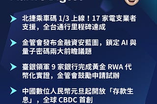 北捷乘車碼 1/3 上線支援 17 家電支業者、金管會發布金融資安藍圖鎖定 AI 與量子密碼、臺銀領軍 9 家銀行完成黃金 RWA 代幣化實證、中國數位人民幣元旦起開放存款生息。本週金融科技的關鍵詞是「落地」,從電支進軍交通、監管框架出爐到區塊鏈商業化,過去幾年的規劃正在跨年週集中兌現。