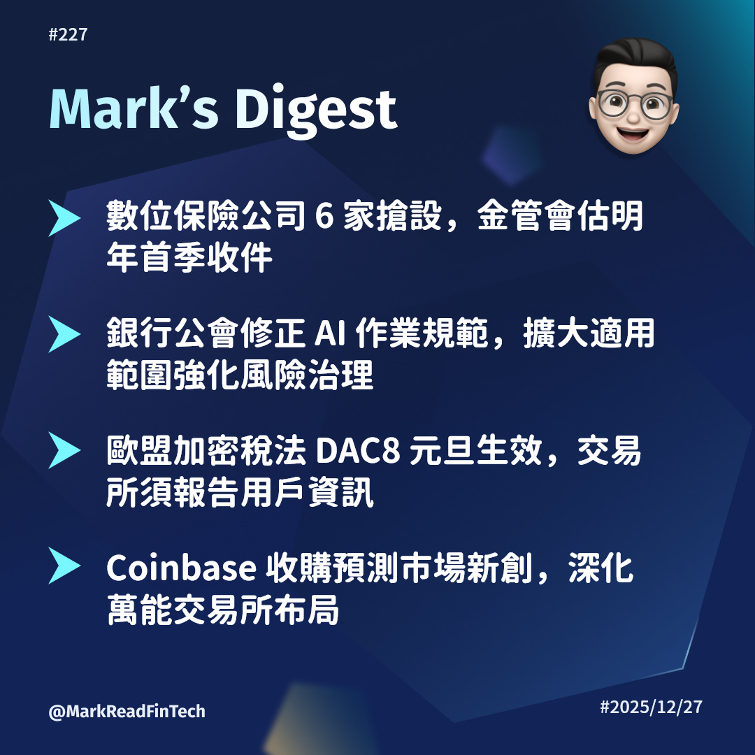 歐盟 DAC8 加密稅法元旦生效、台灣數位保險公司 6 家搶設、銀行公會擴大 AI 規範適用範圍、Coinbase 收購預測市場新創。本週全球金融科技的關鍵詞是「規範化」,從監管框架到市場准入,創新正式進入規範經營時代。