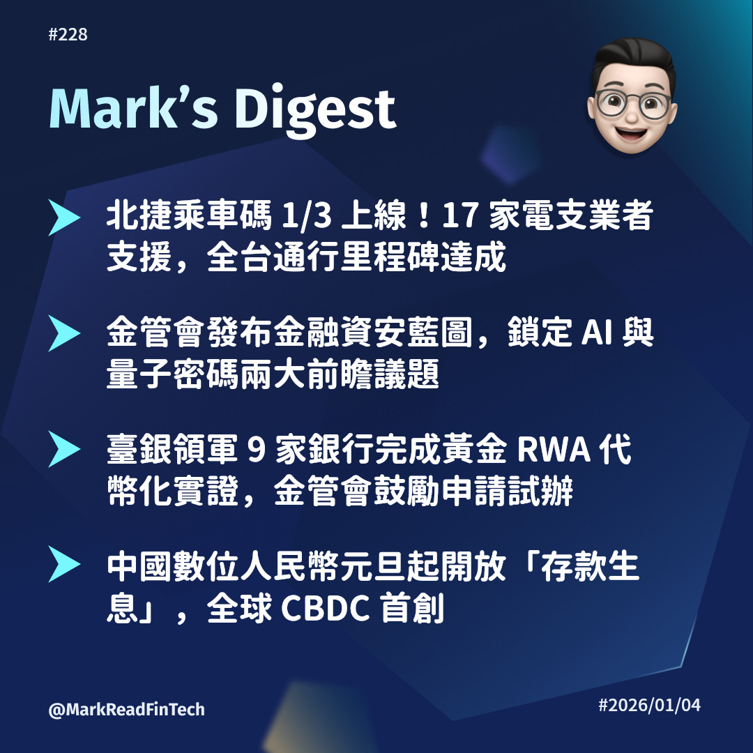 北捷乘車碼 1/3 上線支援 17 家電支業者、金管會發布金融資安藍圖鎖定 AI 與量子密碼、臺銀領軍 9 家銀行完成黃金 RWA 代幣化實證、中國數位人民幣元旦起開放存款生息。本週金融科技的關鍵詞是「落地」,從電支進軍交通、監管框架出爐到區塊鏈商業化,過去幾年的規劃正在跨年週集中兌現。