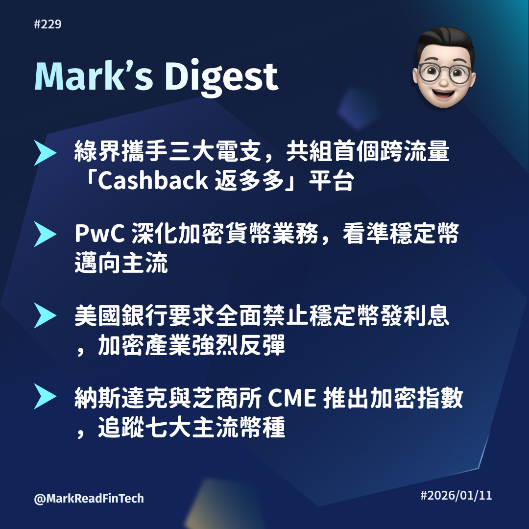 綠界攜手三大電支打造首個跨流量返利平台、PwC 深化加密業務看準穩定幣主流化、美國銀行要求禁止穩定幣發利息引發產業反彈、納斯達克與 CME 聯手推出加密指數,加密貨幣正從邊緣走向主流金融體系的核心。