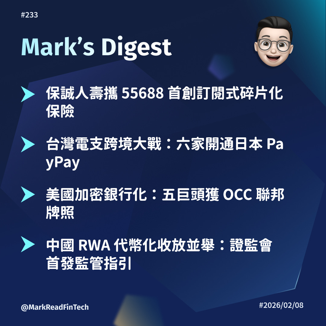保誠人壽攜 55688 推出每趟 1 元碎片化保險。台新、全盈開通日本 PayPay,六家電支搶灘跨境市場。美國 OCC 批准 Circle、Ripple 等五家加密巨頭取得聯邦銀行牌照。中國證監會首發 RWA 代幣化監管指引,採境內禁止、境外備案雙軌制。