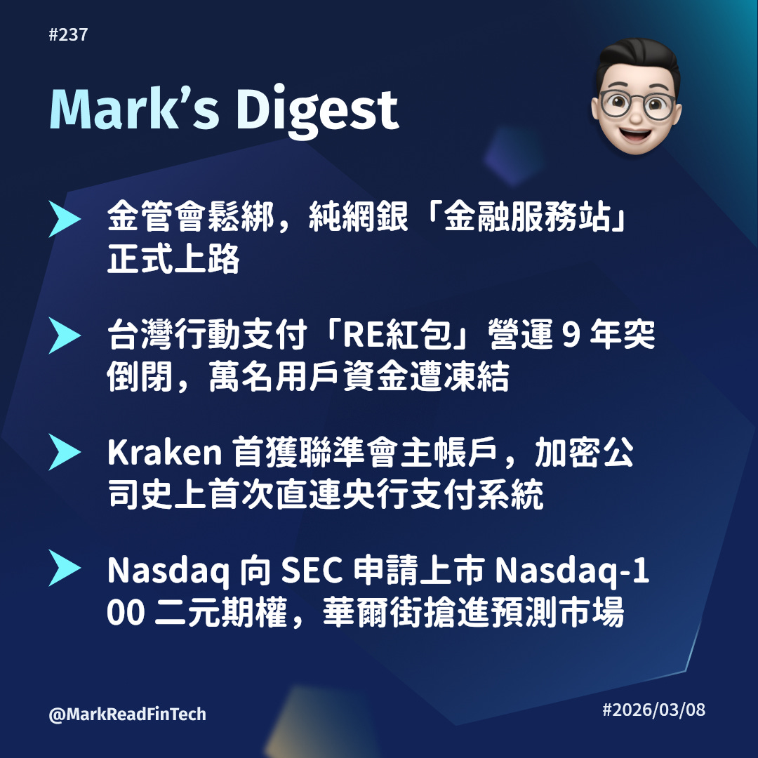 金管會開放純網銀設立金融服務站,走向虛實融合。RE紅包營運9年突倒閉,萬名用戶資金遭凍結凸顯非持牌平台風險。Kraken成為首家直連聯準會支付系統的加密公司。Nasdaq向SEC申請Nasdaq-100二元期權,華爾街搶進預測市場。本週金融科技邊界持續消融,加密與傳統金融加速整合。