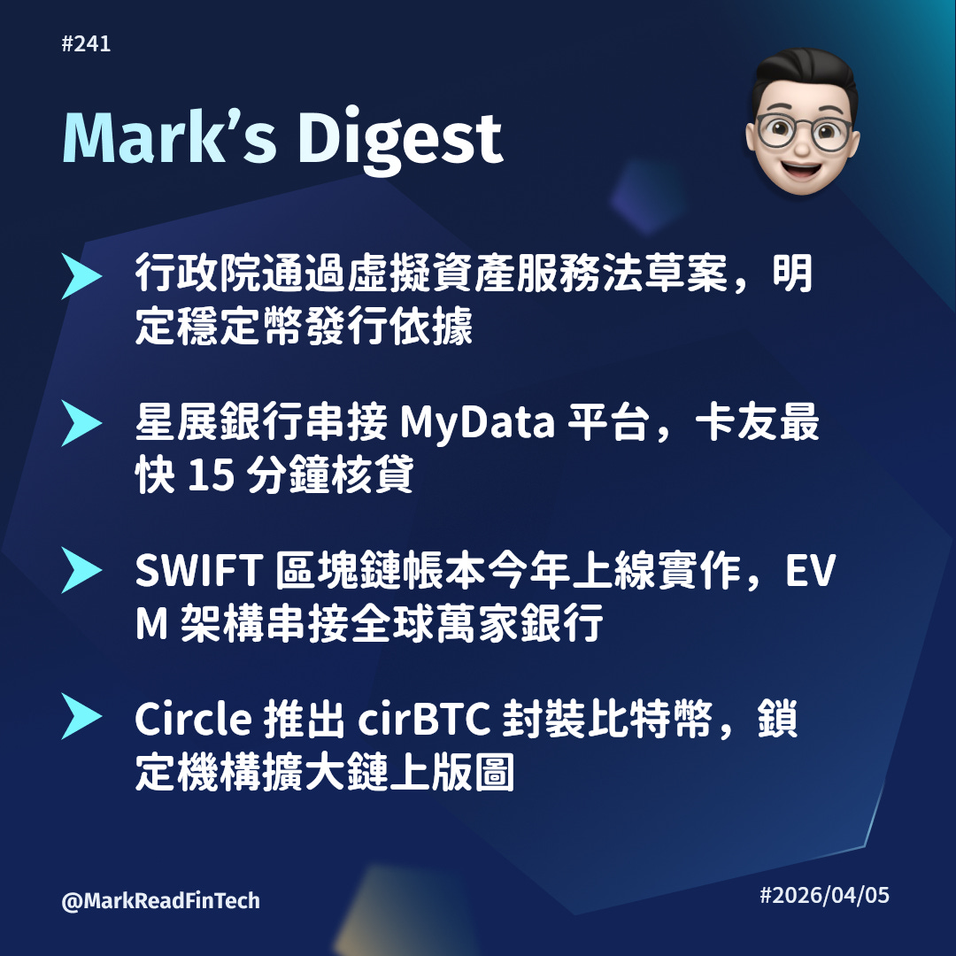 行政院通過虛擬資產服務法草案明定穩定幣發行框架、星展銀行串接 MyData 平台信貸 15 分鐘核貸、SWIFT 區塊鏈帳本啟動 MVP 串接全球萬家銀行、Circle 推出 cirBTC 搶進封裝比特幣市場。