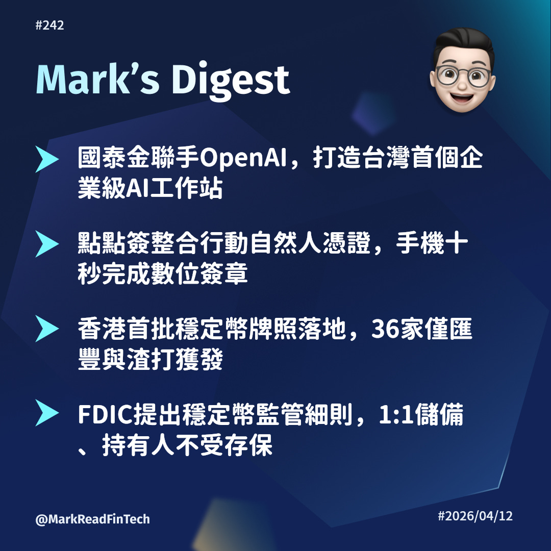 國泰金攜手 OpenAI 打造台灣金融業首個 AI 工作站、點點簽整合行動自然人憑證實現手機數位簽章、香港首批穩定幣牌照僅匯豐與渣打獲發、FDIC 提出穩定幣五大監管細則。穩定幣監管在亞洲和美國同步收緊框架,AI 從支付前端滲透到金融後台營運。