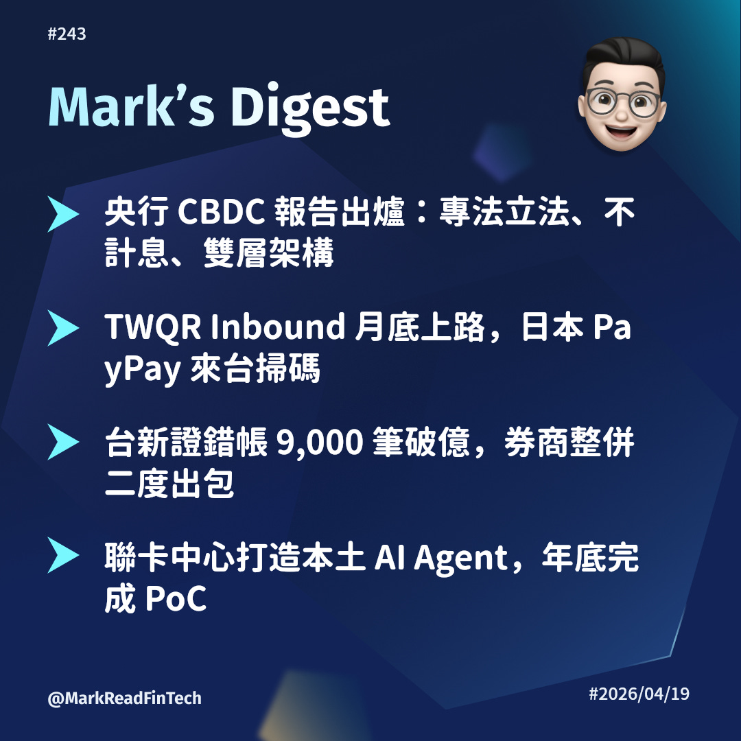 央行 CBDC 報告定調專法立法與雙層架構、TWQR Inbound 月底啟用日本 PayPay 與新加坡 NETS 來台掃碼、台新證合併後錯帳 9,000 筆全額承擔、聯卡中心打造本土 AI Agent 年底完成 PoC。