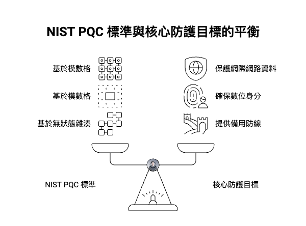 為了搶在 Q-Day 之前完成防禦部署,美國國家標準技術研究所(NIST)在 2024 年 8 月正式發布了首批三項後量子密碼學(PQC)標準。這三項標準為全球的加密遷移工程提供了統一的技術基礎。