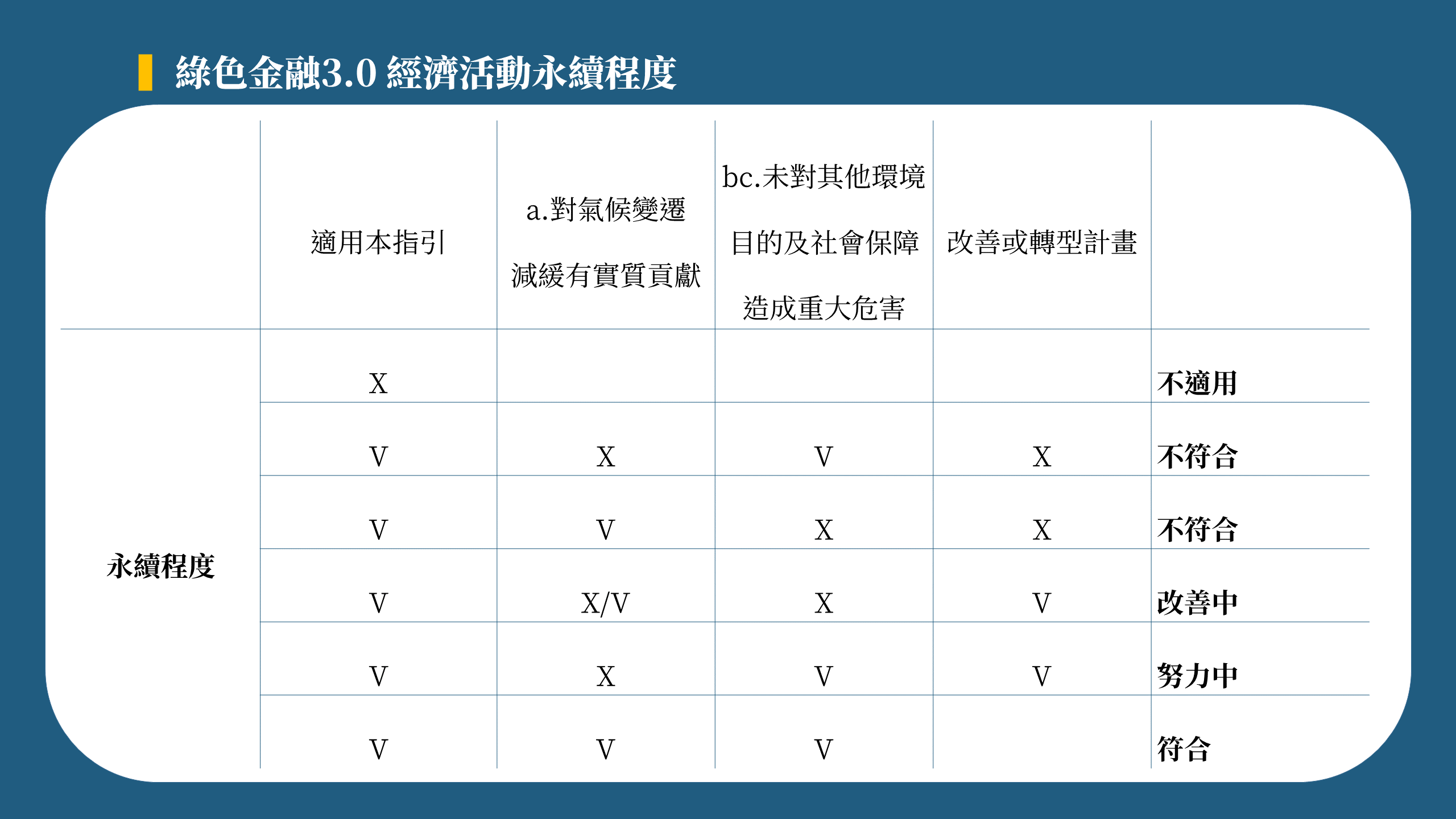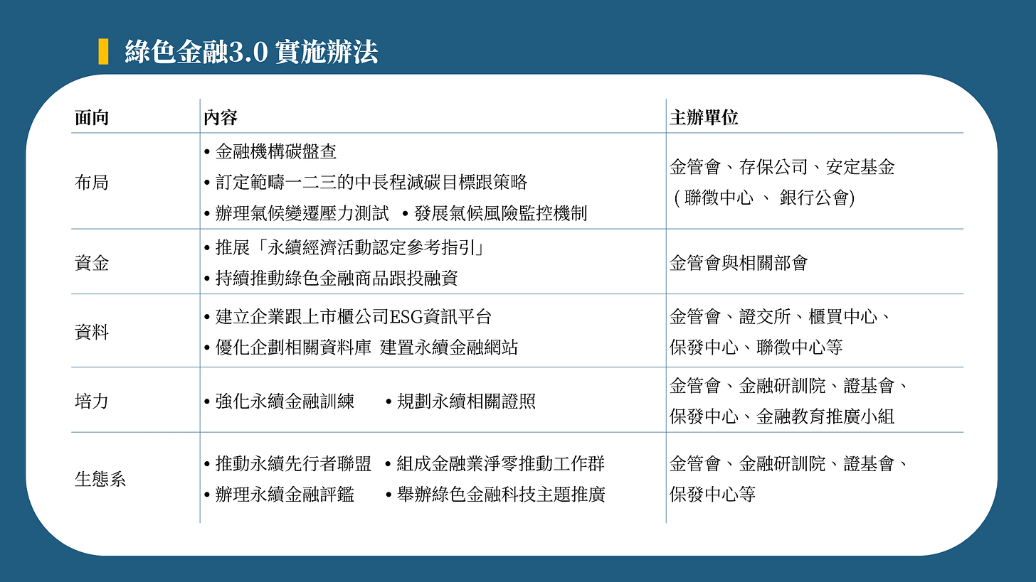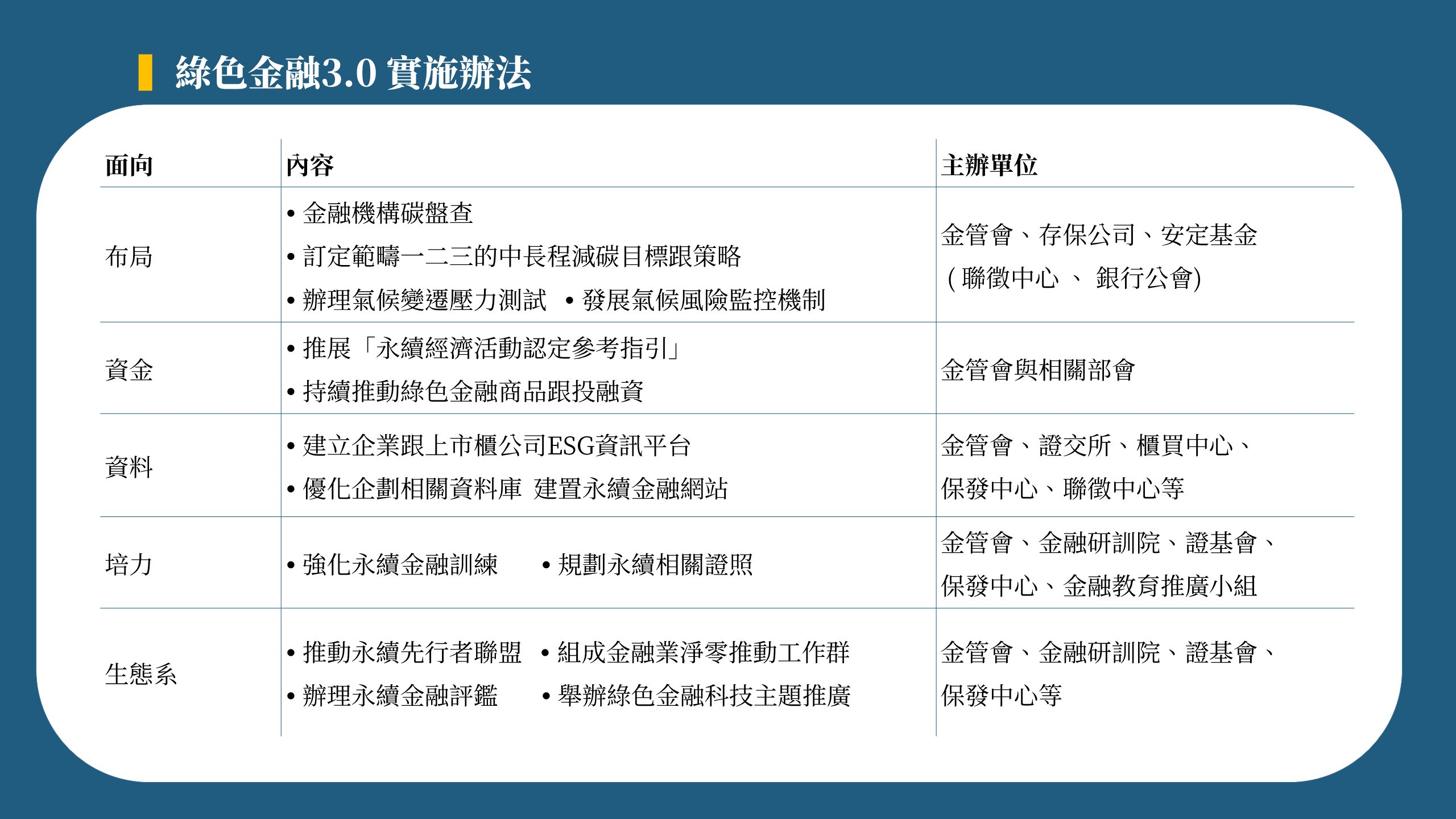 (表格參考:陳信宏、施志寬。綜覽臺灣金管會「綠色金融行動方案3.0」 - Lee, Tsai & Partners。)