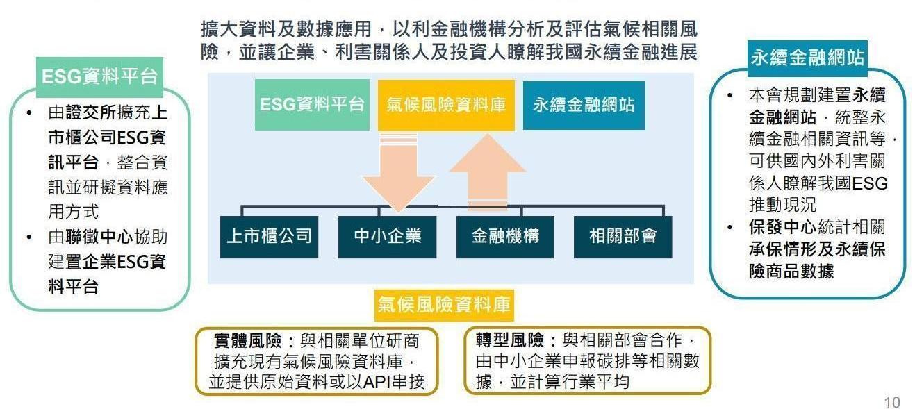 建立企業跟上市櫃司的 ESG 資料平台,統計氣候變遷因應及永續保險相關數據,與政府合作優化氣候變遷風險資料庫,並建置「永續金融網站」,集結統計、規範、交流和評鑑等相關資訊,讓金融機構分析,並讓企業、利害關係人及投資者了解永續金融進展。