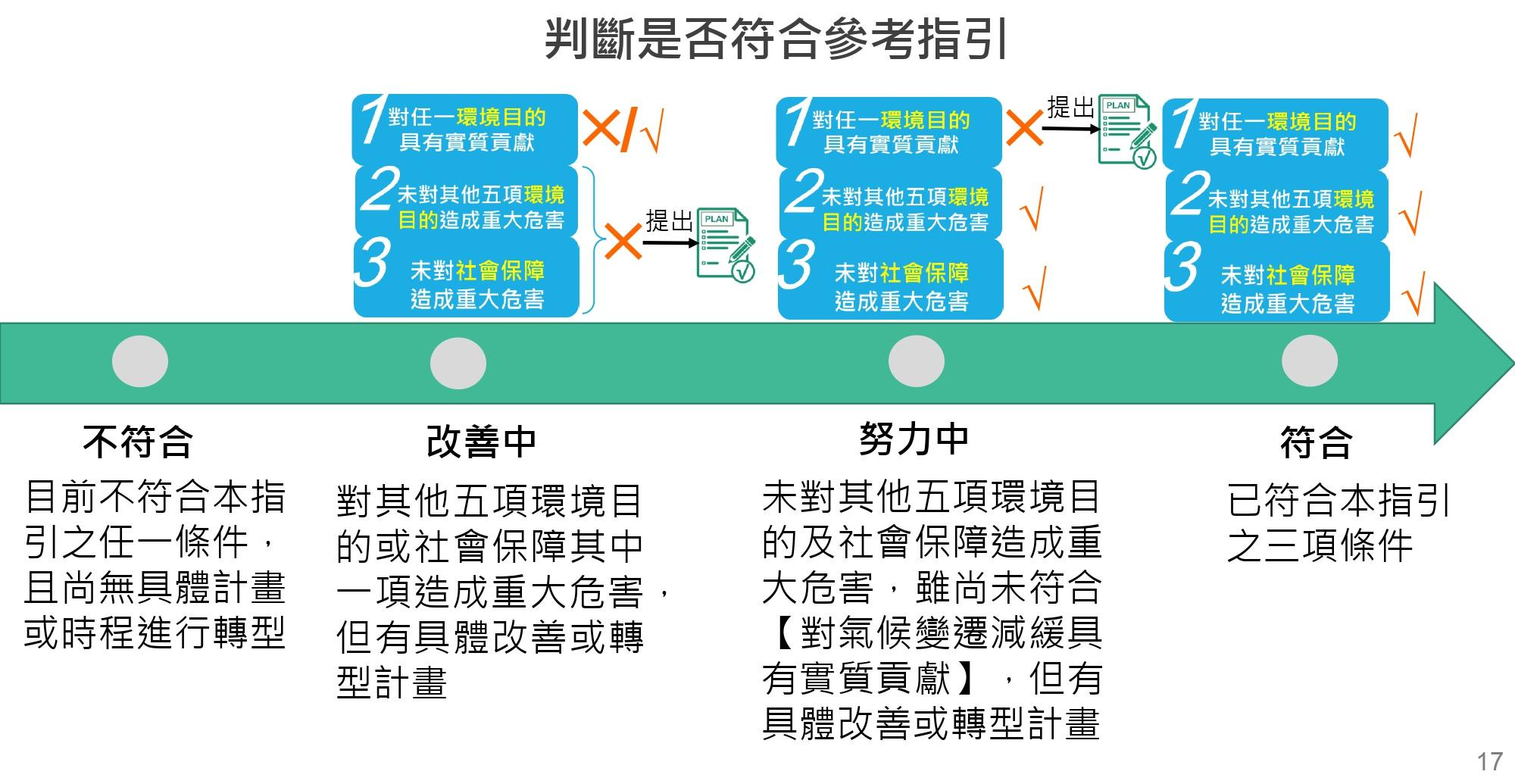企業可依其經濟活動「適用」與「符合」前揭3項條件之情形,以及有無具體改善或轉型計畫,將經濟活動之永續程度,分為「符合」、「努力中」、「改善中」、「不符合」及「不適用」五類。