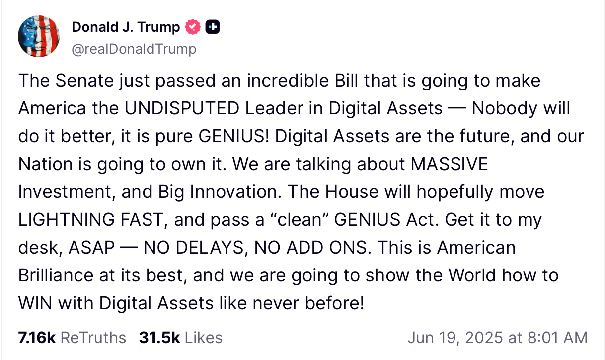 至於白宮對於《天才法案》的回應,川普於 6 月 19 日在社群平臺 Truth Social 發文表示,GENIUS Act 的通過是美國智慧的巔峰之作、簡直是「天才之舉」,要求眾議院「不要拖延、不要加料」,盡快將法案送進白宮簽署。
