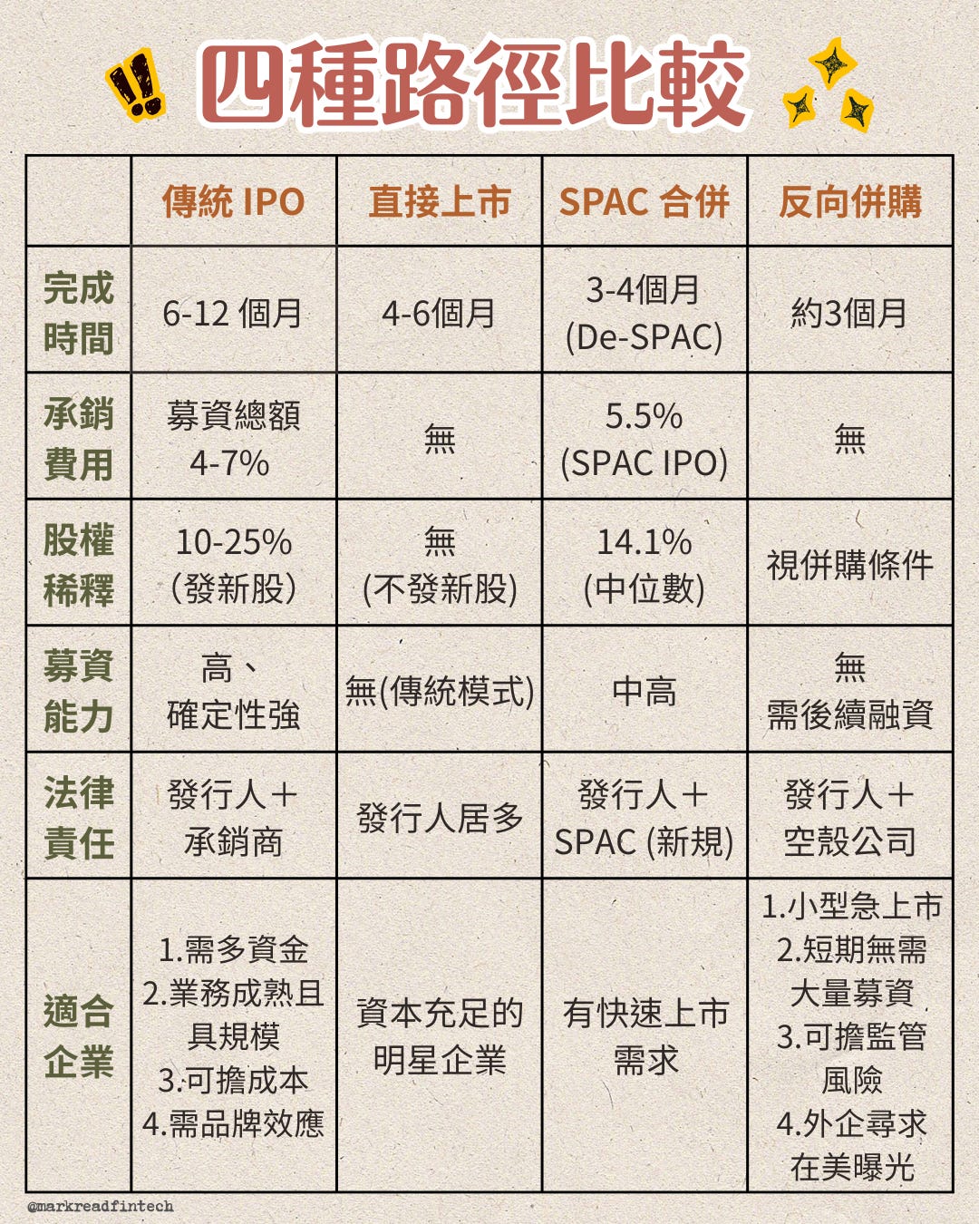 風險承受能力:若企業追求穩健,傳統 IPO 監管確定性最高;若願意承擔價格波動與監管不確定性,其他途徑可能更快更便宜。