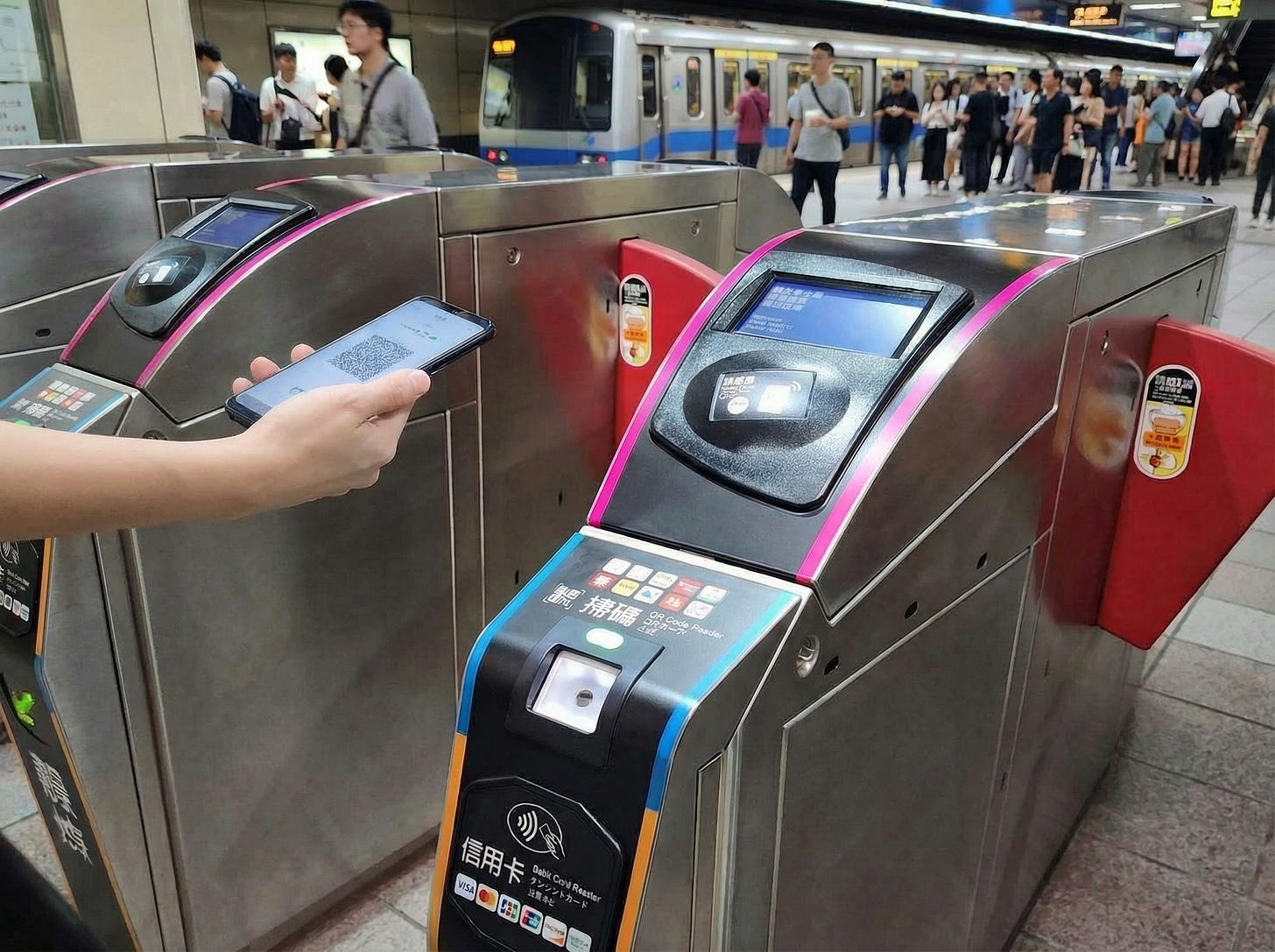 旅客依照需求選擇電子支付 APP 中的「QR 乘車碼」掃描進、出閘門(注意:乘車碼跟付款碼是不同的喔!),進、出站需使用相同支付帳戶掃碼。若進站前,帳戶餘額為負值,則無法進站搭乘;若進站後帳戶餘額不足以支付當趟車資時,將由支付業者代墊一次。