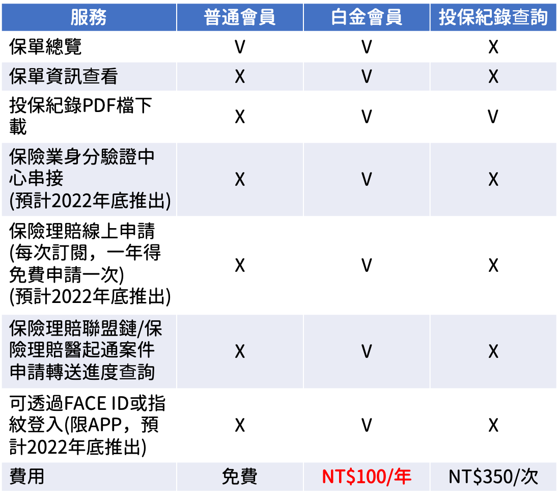 保險存摺分為普通會員及白金會員,如想成為白金會員需每年繳年費100元,才能看到自己投保的所有保單,即享有後續所有延伸的功能,若只是免費的普通會員只能看到一張保單。截至十月中旬,已註冊的20萬會員中,有8.8萬人加入白金會員。
