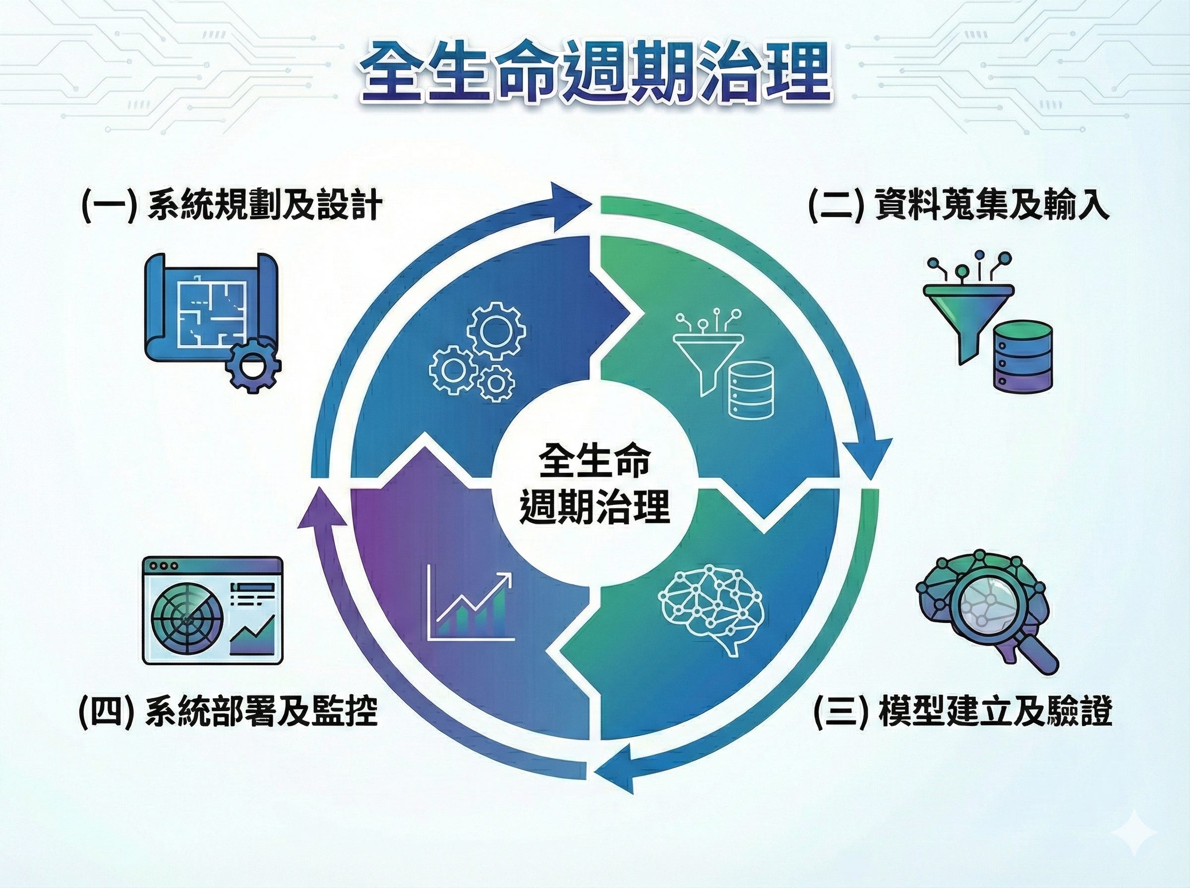 本次修正強調,AI 治理並非上線前的一次性審查,而是貫穿模型全生命週期的動態管理。規範將其嚴謹地定義為四個階段: