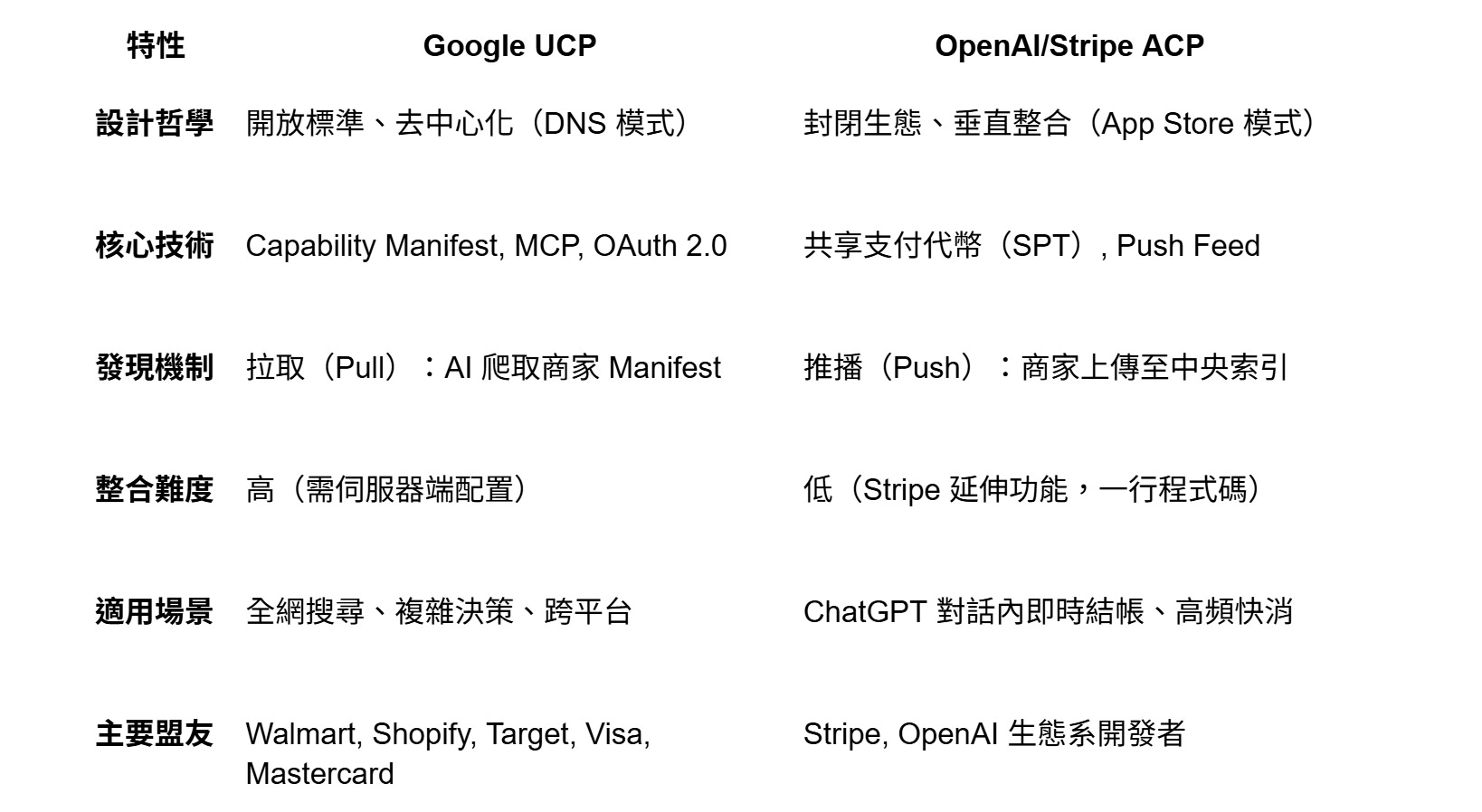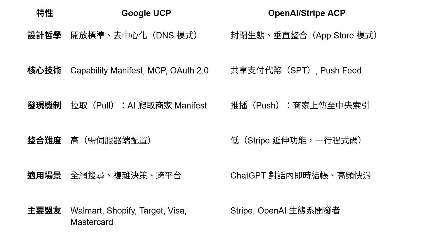 協議對決與哲學: Google UCP(開放/DNS 模式)與 OpenAI/Stripe ACP(封閉/App Store 模式)的對決,是 AI 時代開放去中心化網路與封閉圍牆花園兩種網際網路哲學的終極之爭。