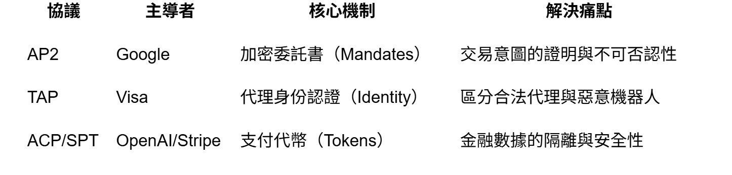 這三種協議並非完全互斥,未來很可能形成「堆疊」關係:TAP 驗證代理身份(這個 AI 是誰?可信嗎?)、AP2 記錄用戶授權(用戶真的同意了嗎?)、ACP/SPT 執行具體交易(怎麼完成這筆買賣?)。