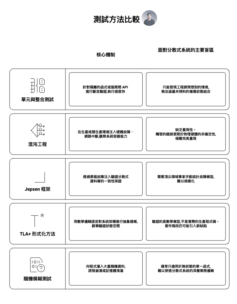 為了對付分散式系統中的隱藏缺陷,軟體工程界發展出了多種測試與驗證方法。但現代雲端架構、微服務與分散式資料庫的複雜度,已經讓系統的「狀態空間」(State Space)呈指數級膨脹。以下是五種主流方法的能力與盲區: