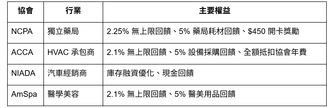 藥局的利潤極薄,大量成本集中在向批發商採購藥品和耗材。NCPA 聯名卡提供 2.25% 的無上限現金回饋,並針對藥局耗材提供 5% 現金回饋。對於年營收數百萬美元的藥局,這些回饋直接轉化為淨利潤的提升。