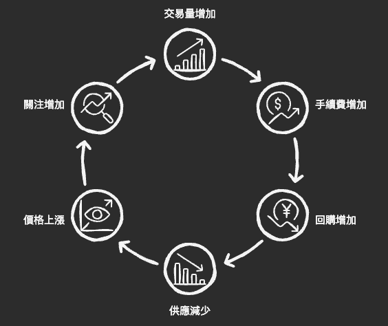 通縮機制創造了清晰的價值捕獲邏輯:交易量越大→手續費越多→回購量越大→代幣供應減少→價格上漲→吸引更多關注→帶來更多交易量。這就是所謂的「飛輪效應」,一旦轉動起來就會自我加速。